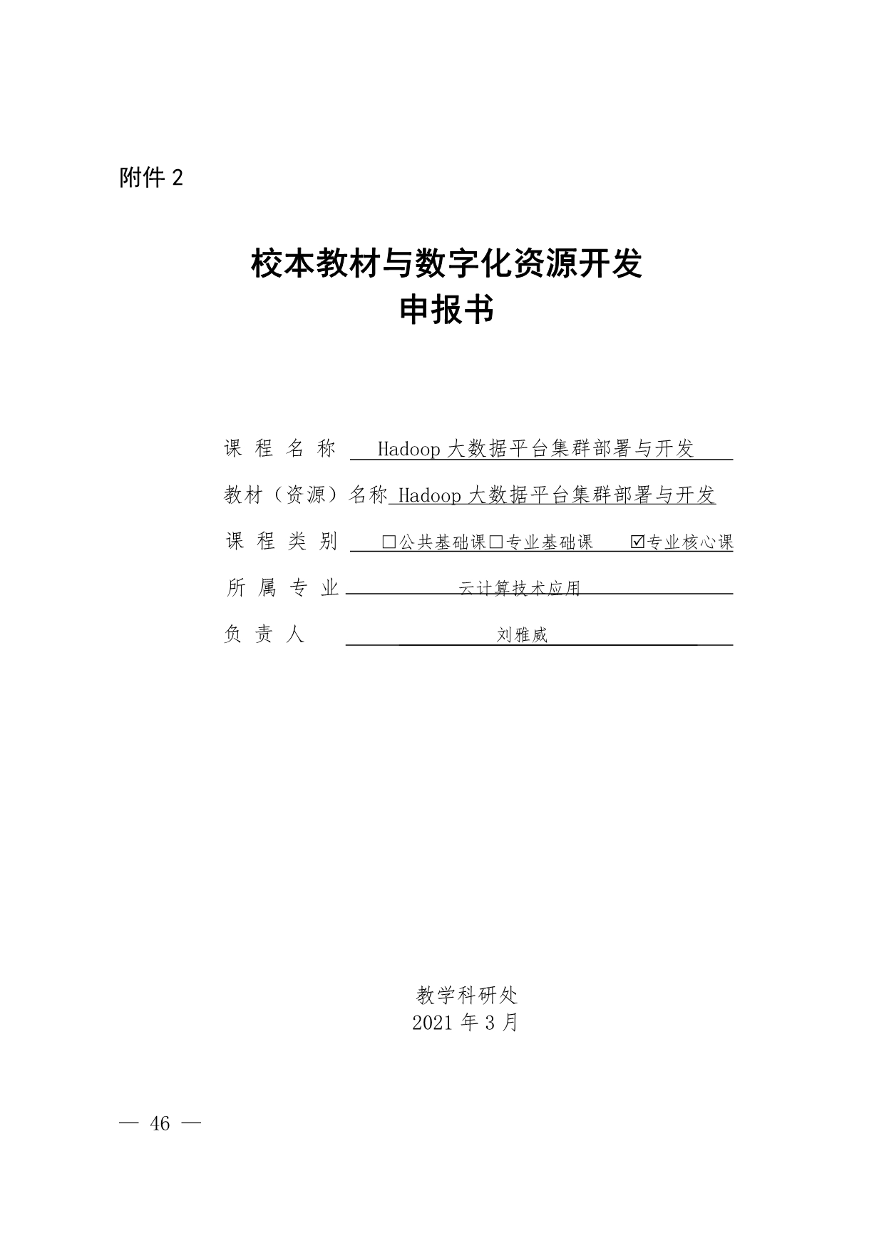 1.《Hadoop大数据平台集群部署与开发》申报书盖章版(刘雅威)