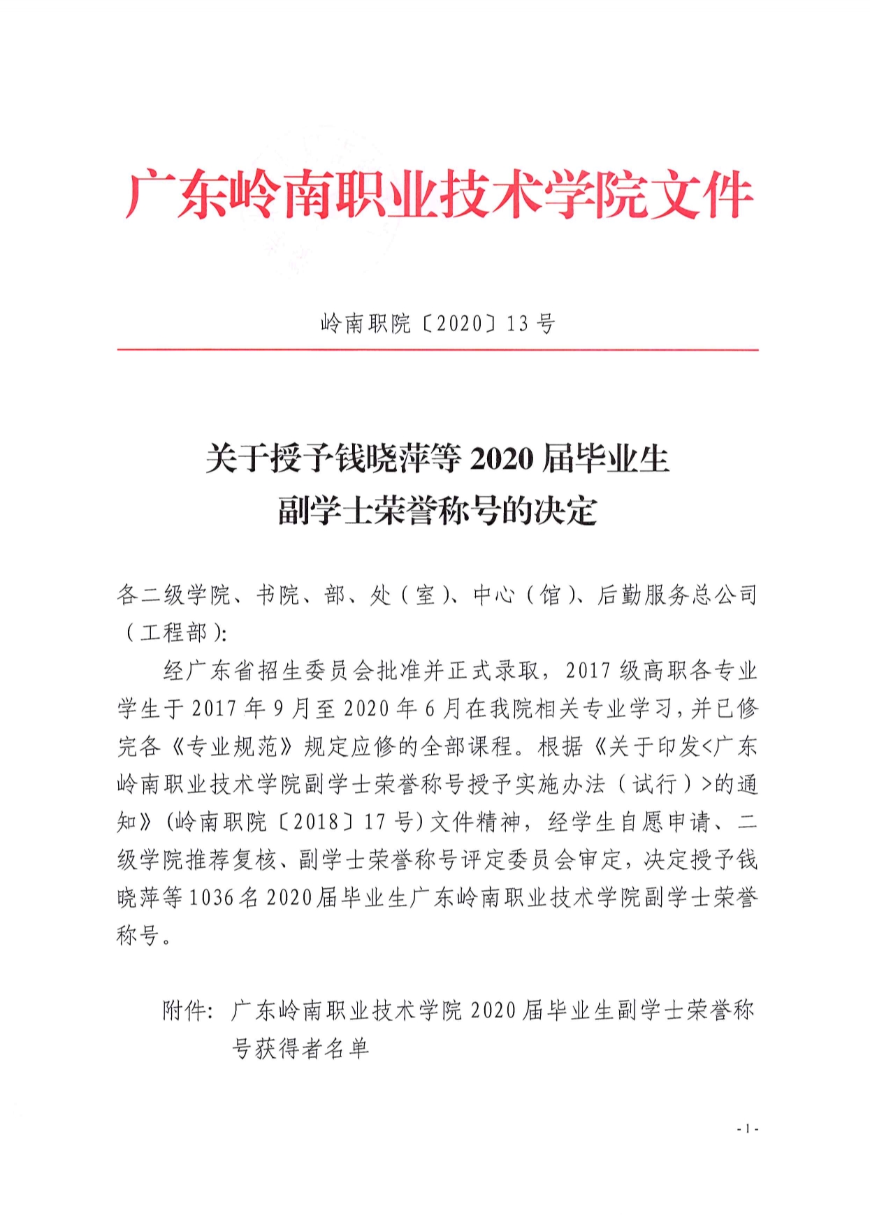 2.1.3-05-关于授予钱晓萍等2020届毕业生副学士荣誉称号的决定