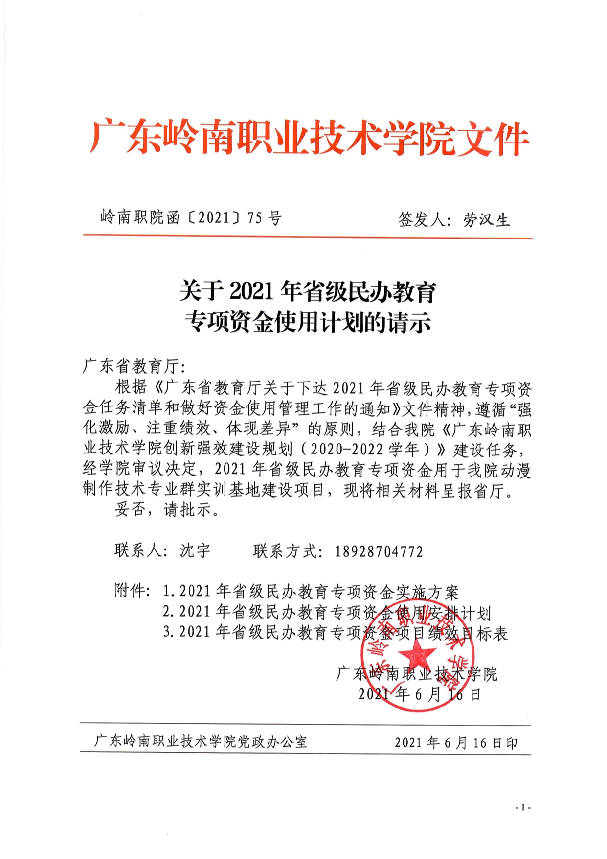 5-1-1-1产学研创一体化实践教学基地建设-岭南职院函[2021]75号 关于2021年省级民办教育专项资金使用计划的请示