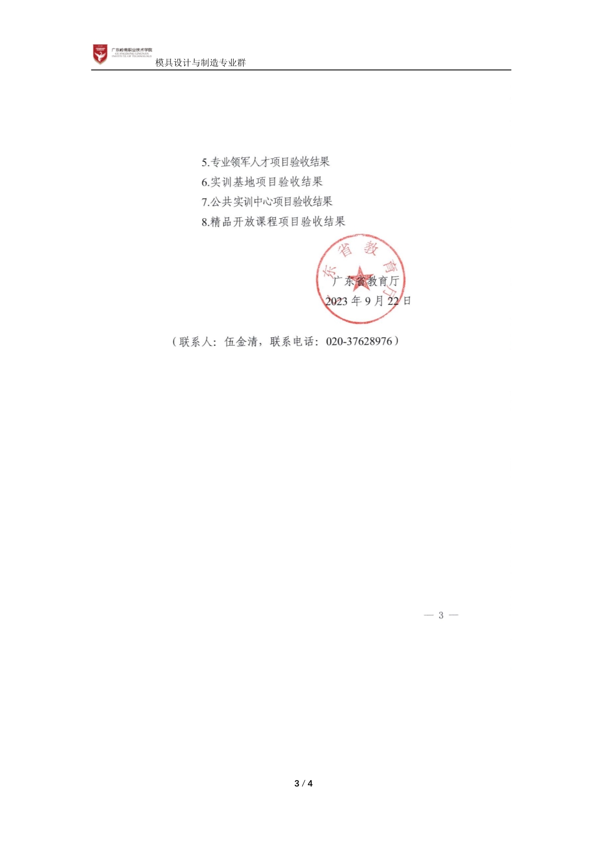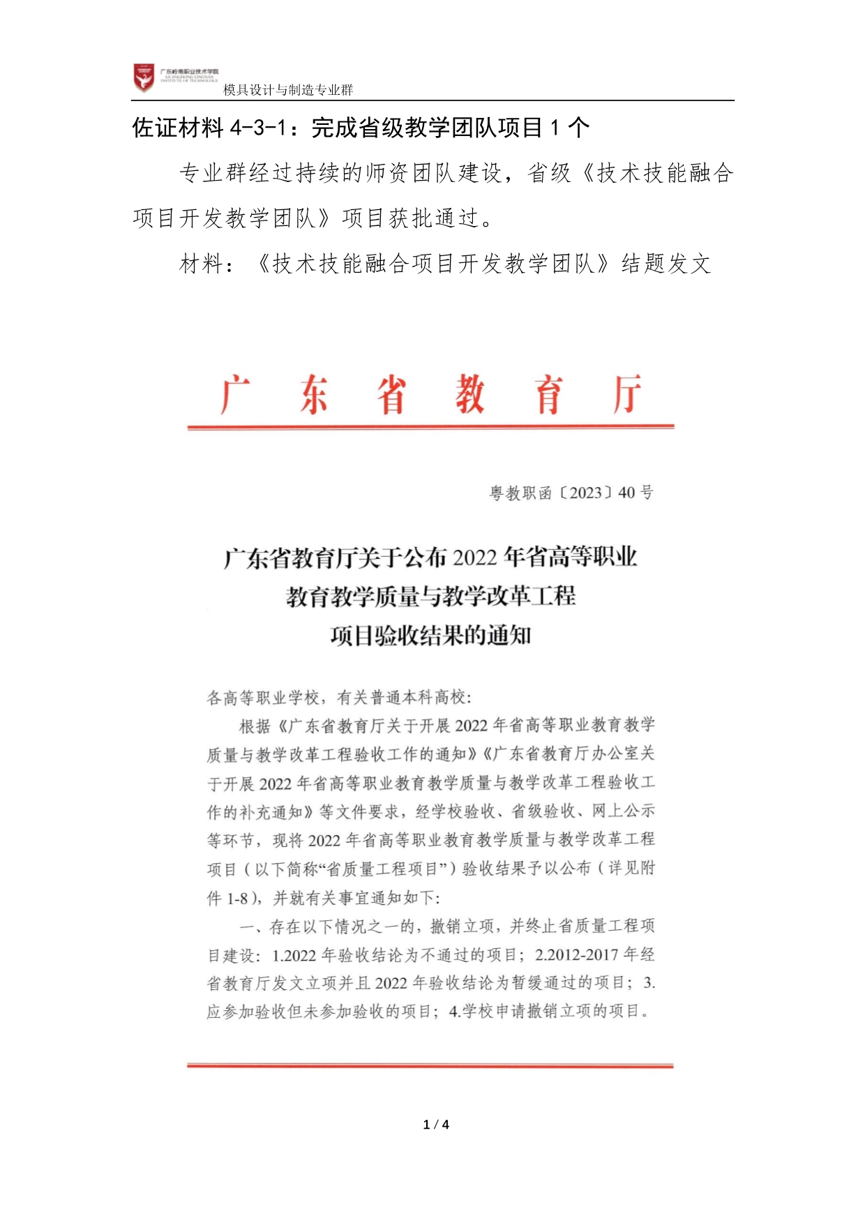 佐证材料4-3-1:完成省级教学团队项目1个