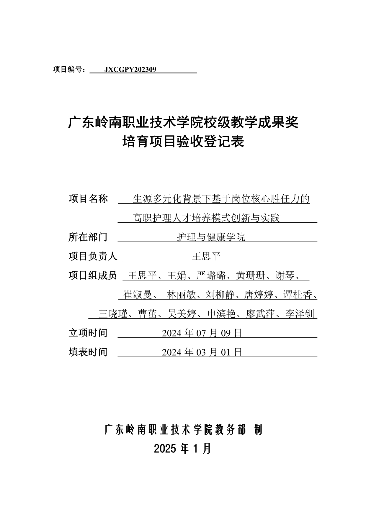 3.《生源多元化背景下基于岗位核心胜任力的高职护理人才培养模式创新与实践》成果验收登记表+王思平