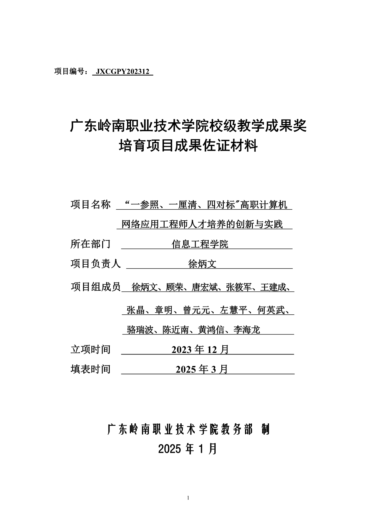 3.《“一参照、一厘清、四对标”高职计算机网络应用工程师人才培养的创新与实践》项目验收登记表+徐炳文