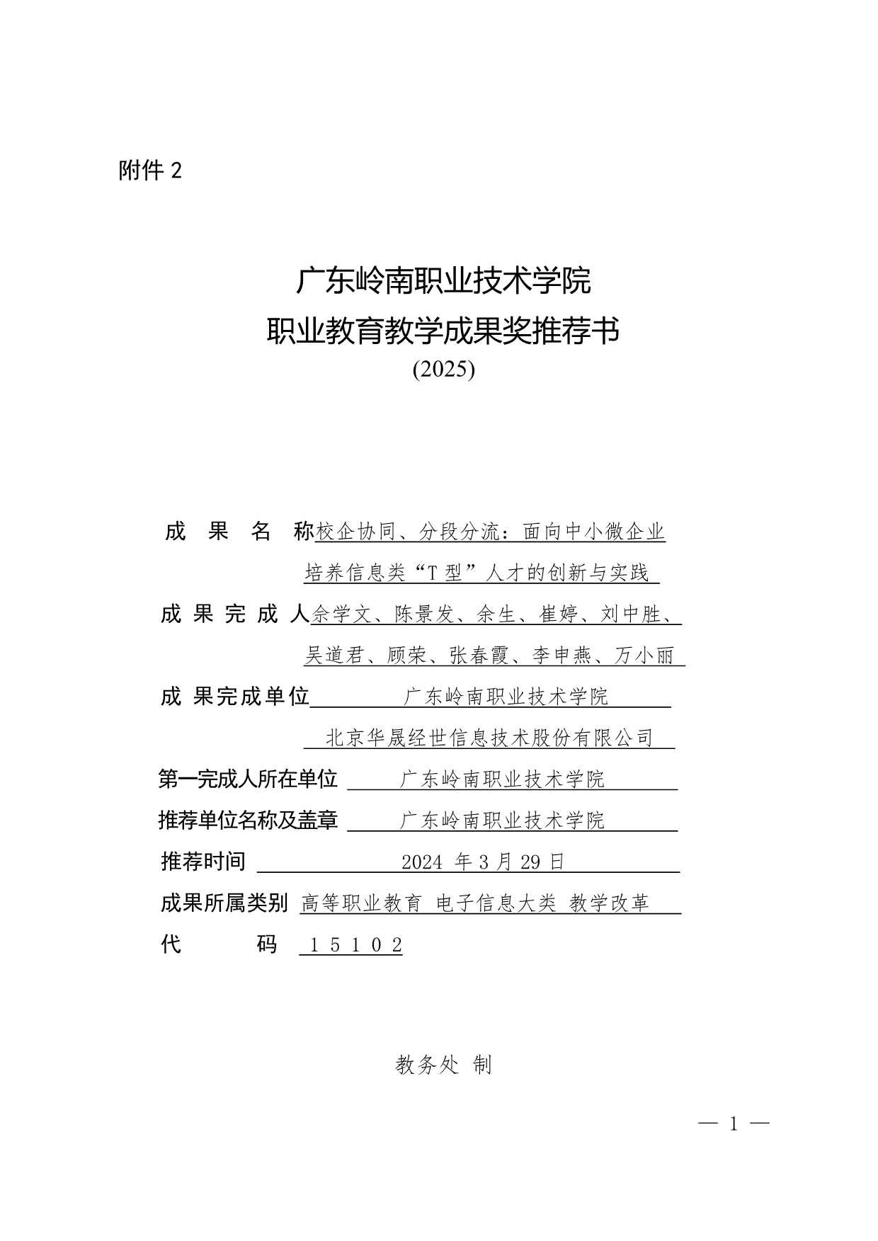 1.《校企协同、分段分流:面向中小微企业培养信息类“T 型”人才的创新与实践》申报书+佘学文
