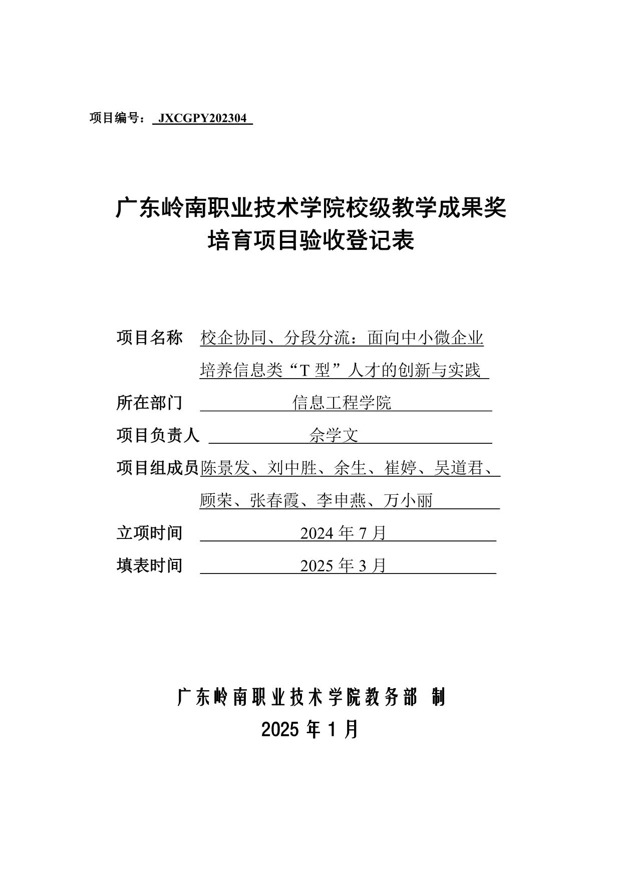 3.《校企协同、分段分流:面向中小微企业培养信息类“T 型”人才的创新与实践》项目验收登记表+佘学文