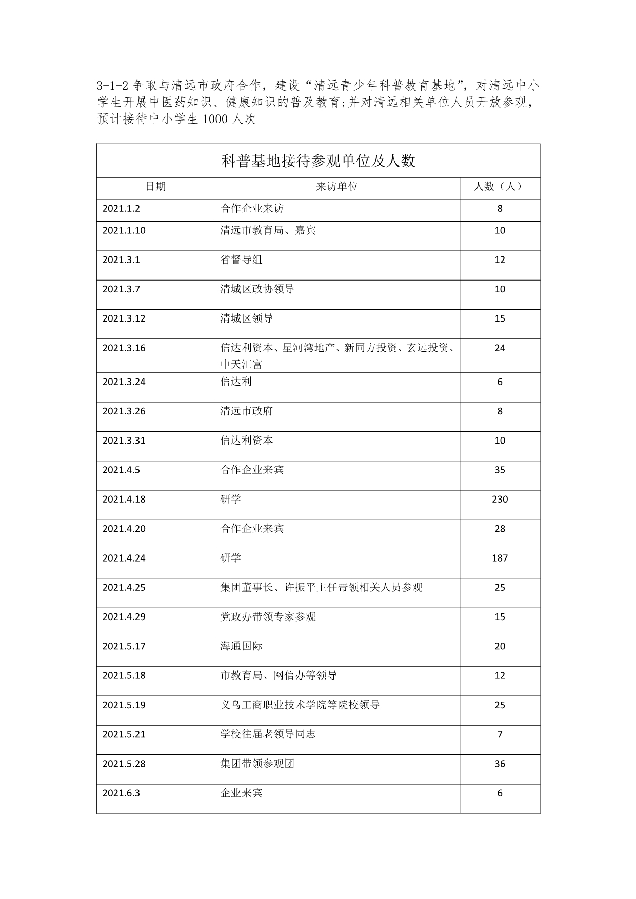 3-1-2争取与清远市政府合作,建设“清远青少年科普教育基地”,对清远中小学生开展中医药知识、健康知识的普及教育;并对清远相关单位人员开放参观,预计接待中小学生1000人次