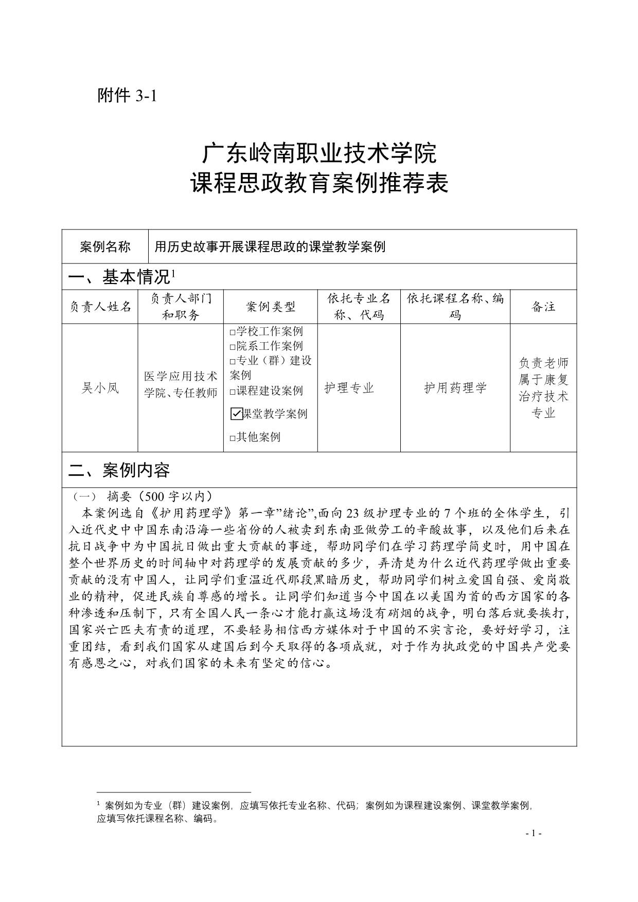 5.《用历史故事开展课程思政的课堂教学案例》“课程思政”教育案例推荐表+吴小凤