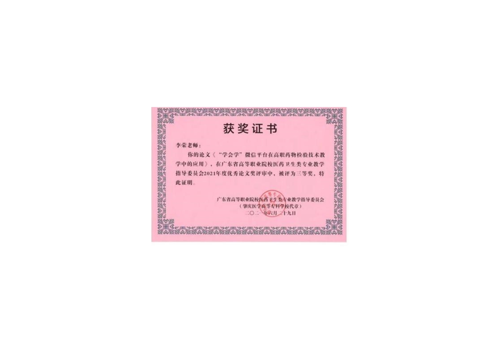 3-2-7 李荣教指委优秀论文三等奖证书