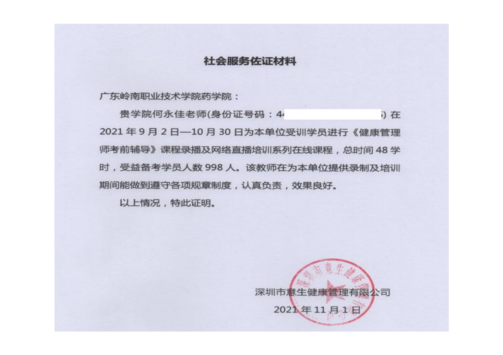 7-2-2何永佳老师完成健康管理师考前培训课程培训998人次佐证