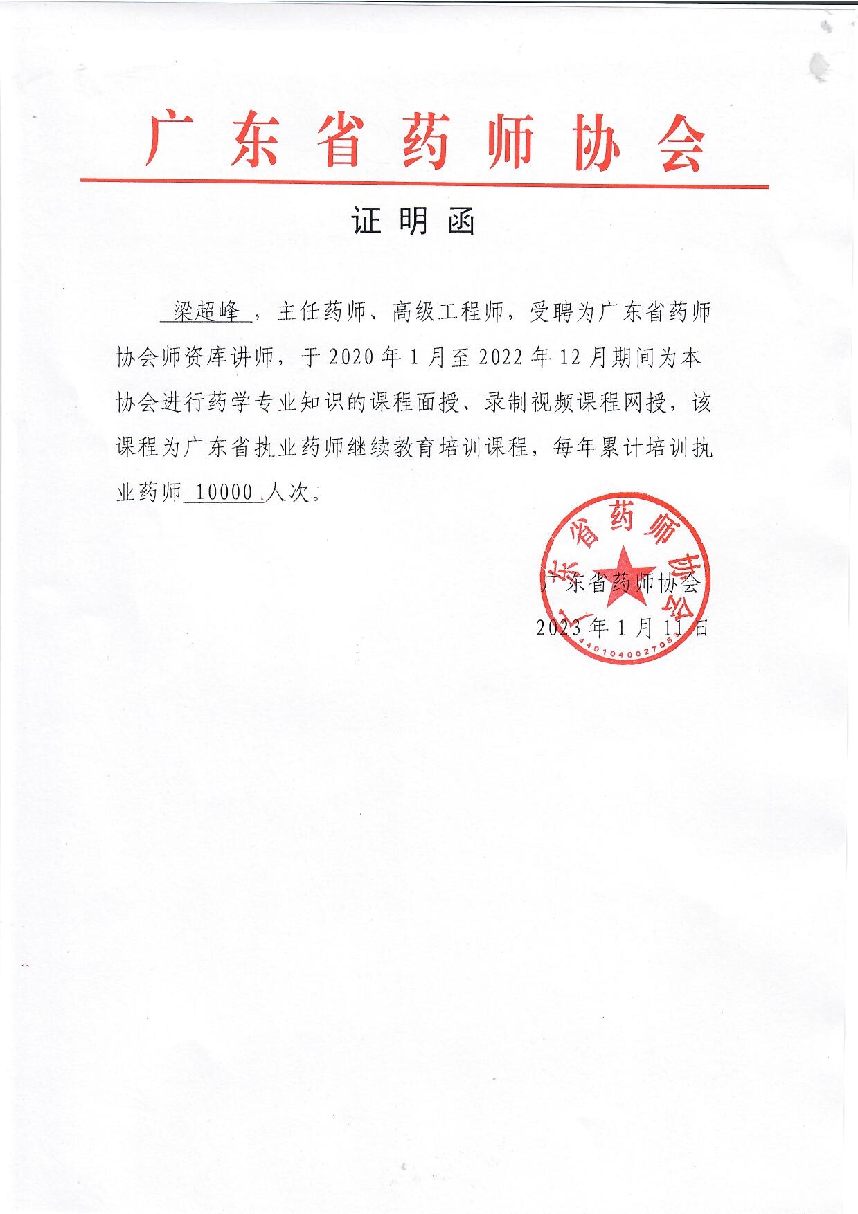 7-2-4 梁超峰老师完成执业药师继续教育培训10000人