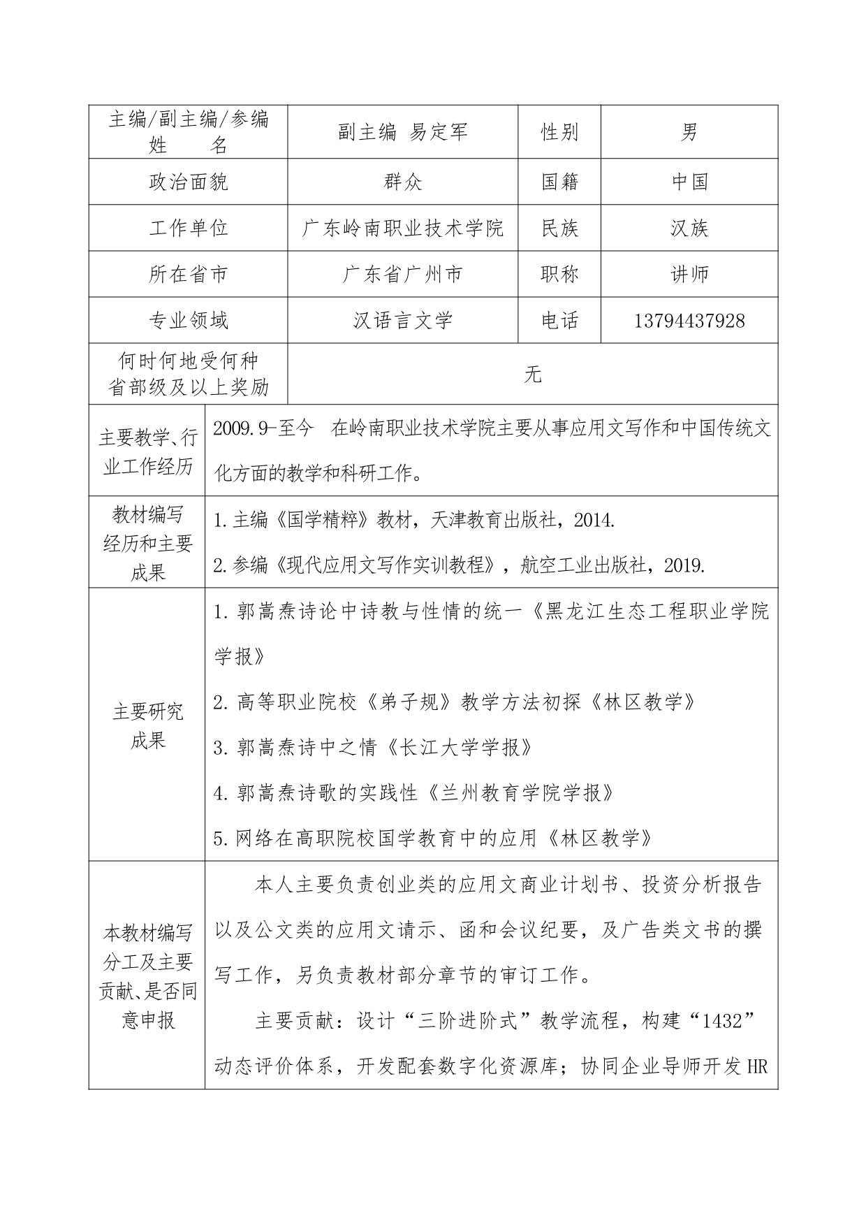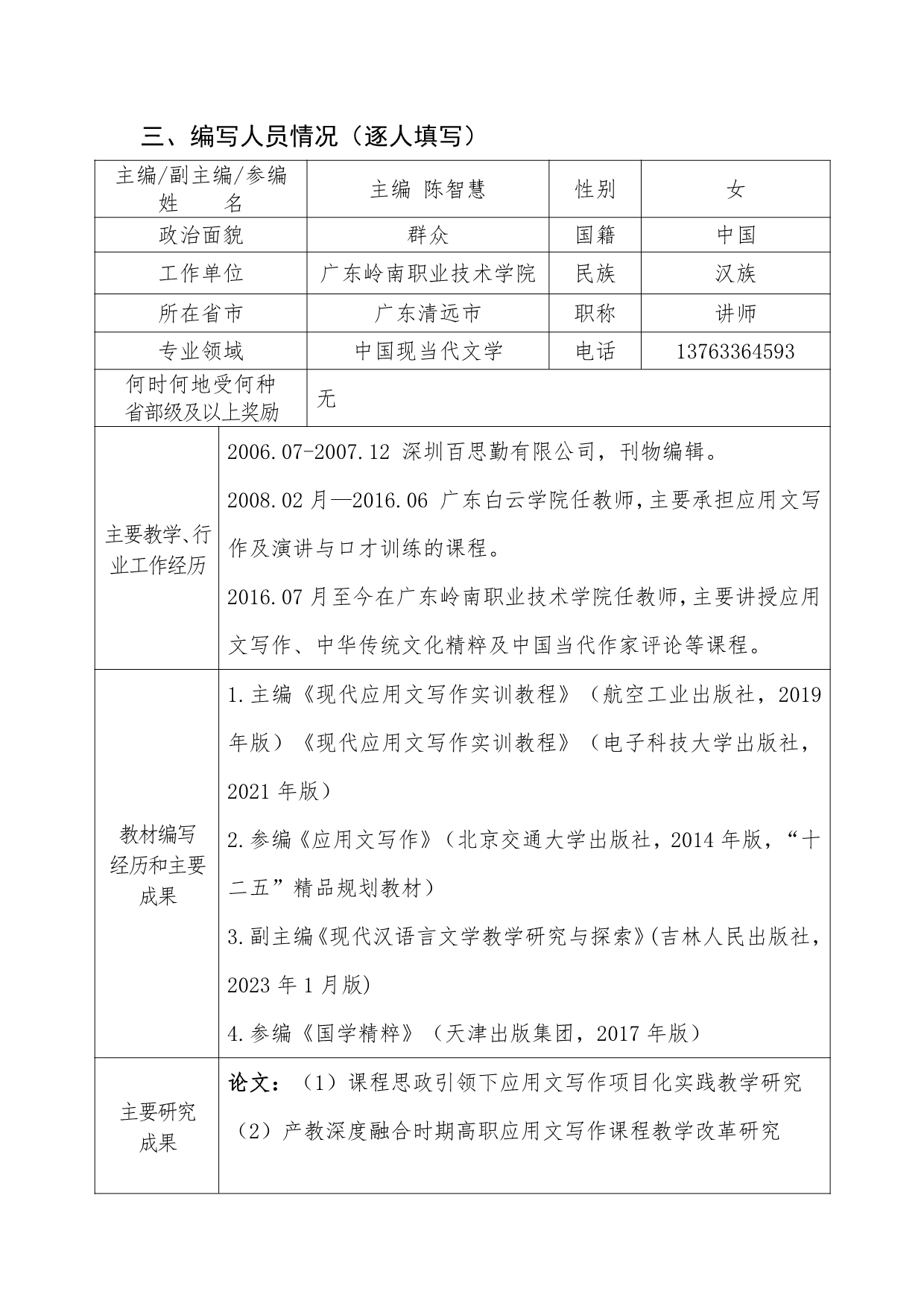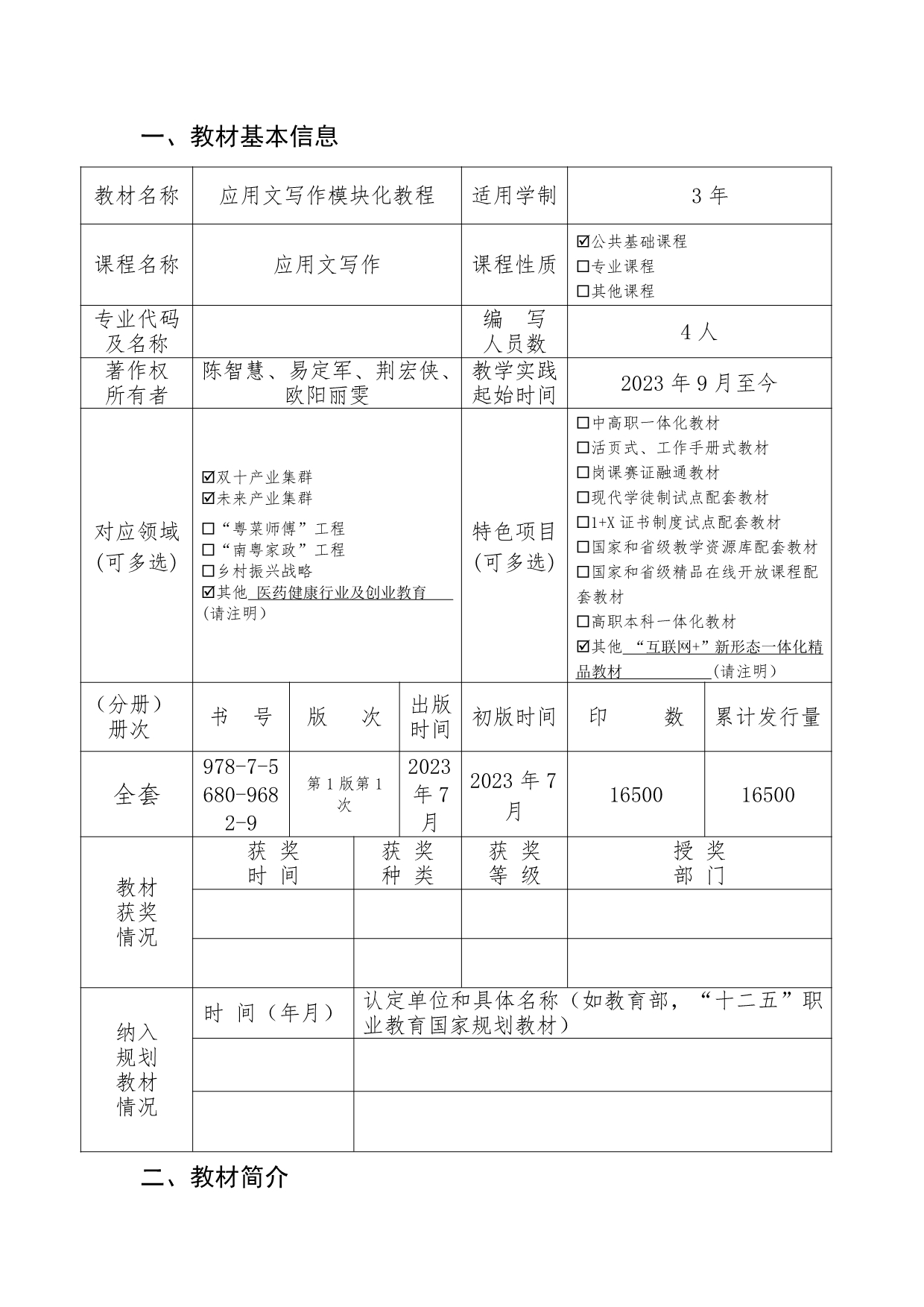 1. 附件3:第二批广东省“十四五”职业教育规划教材申报表《应用文写作模块化教程》+陈智慧